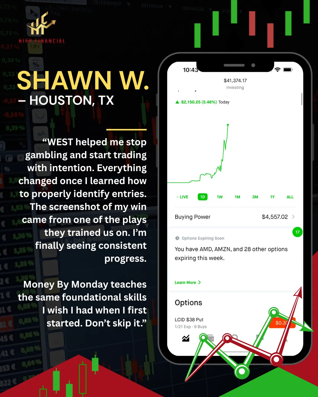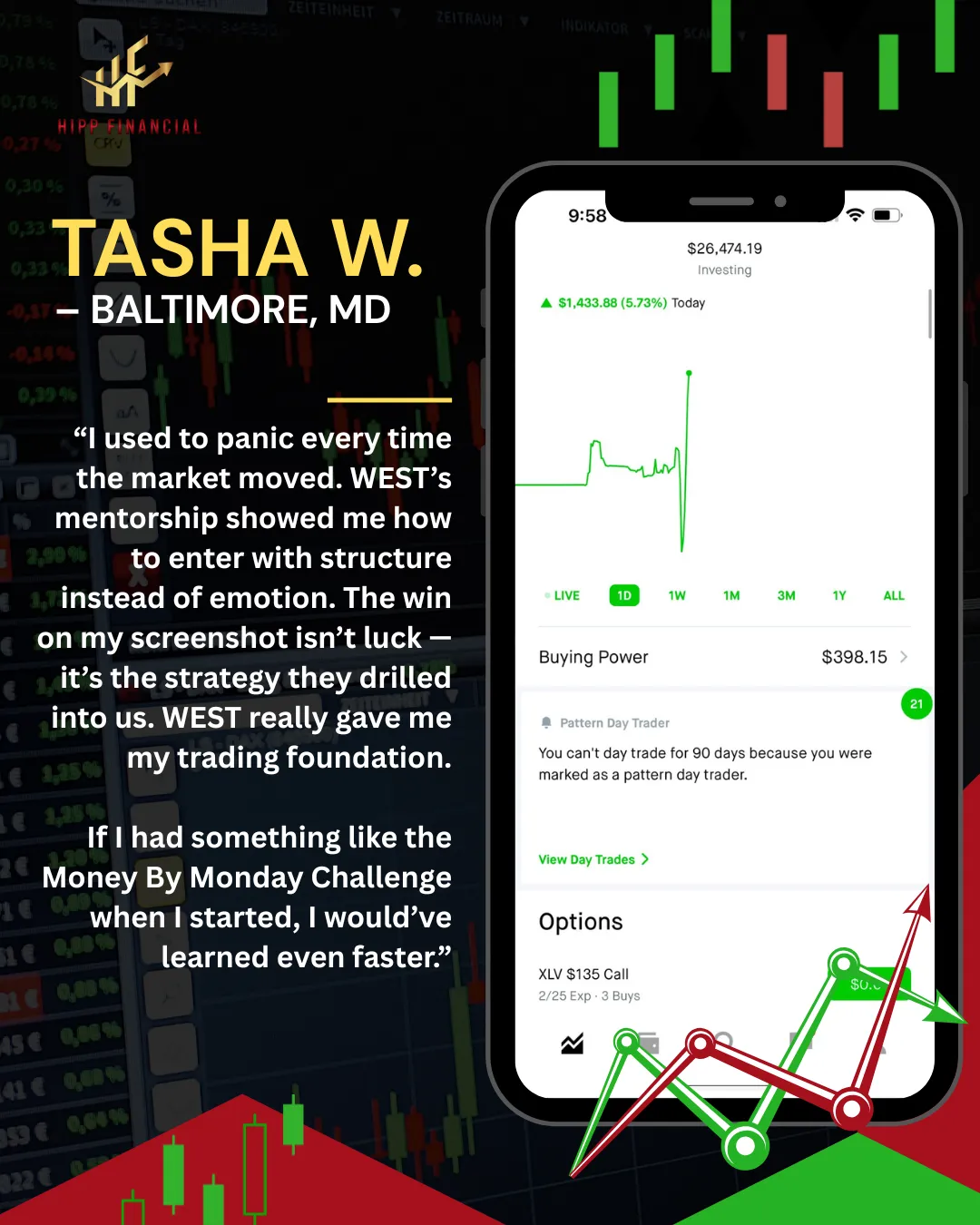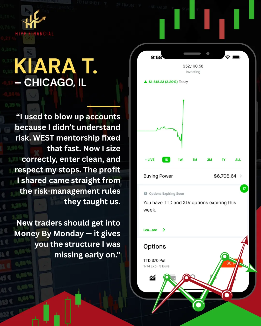 Money By Monday is a 3-day live trading challenge designed to help beginners and struggling traders understand how options trading really works — from mindset, platform setup, chart reading, and finding trade setups, all the way to placing a practice live trade with real-time mentorship. It’s hands-on, beginner-friendly, and built for fast learning.