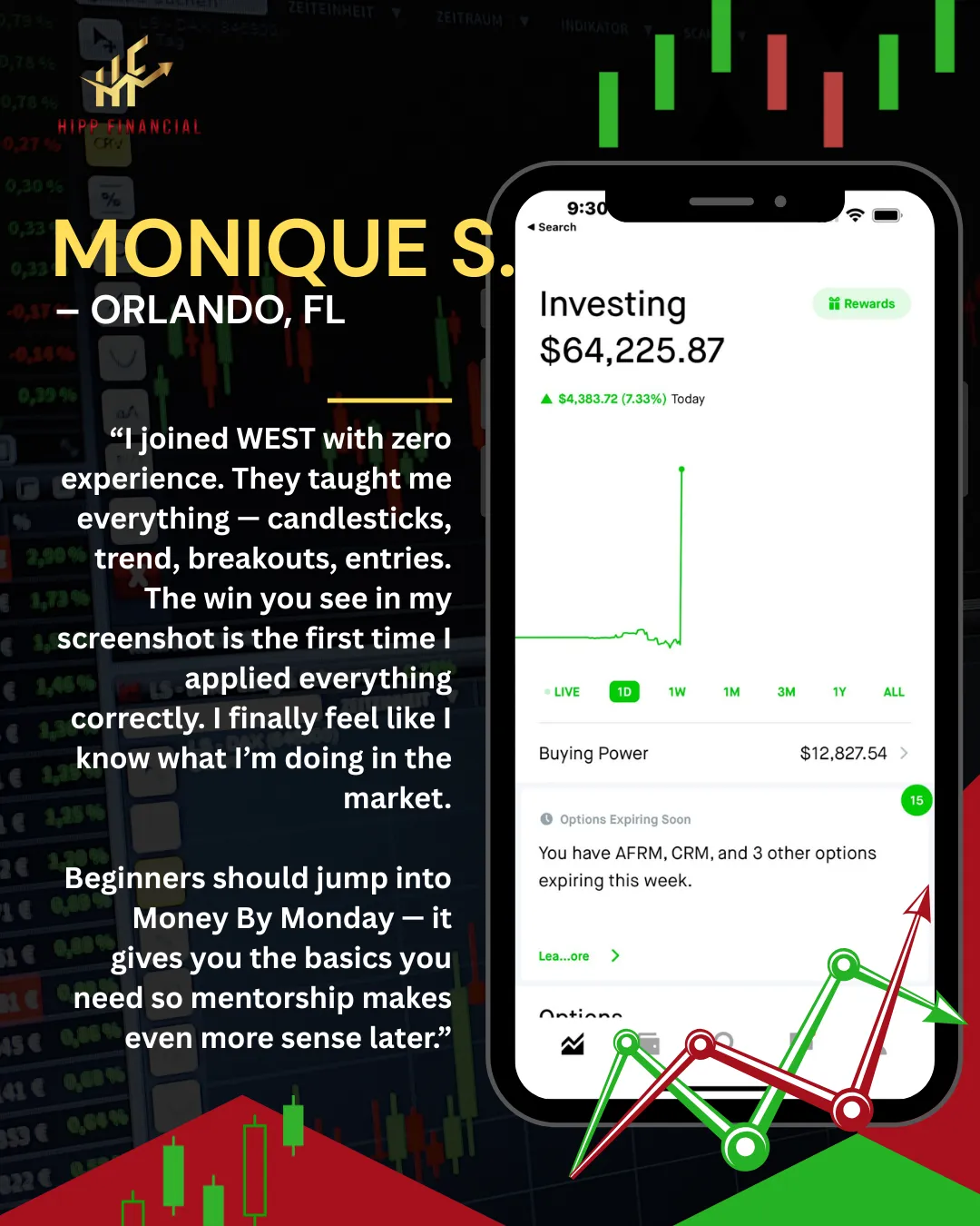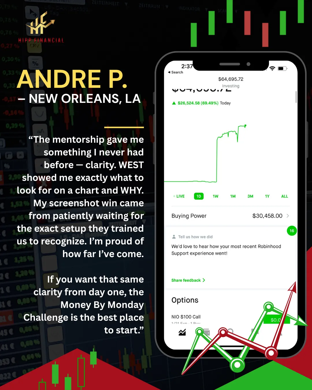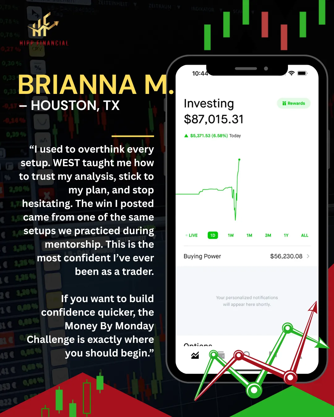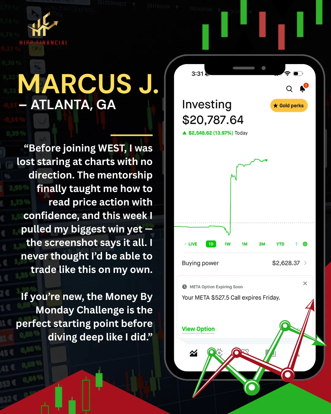 Money By Monday is a 3-day live trading challenge designed to help beginners and struggling traders understand how options trading really works — from mindset, platform setup, chart reading, and finding trade setups, all the way to placing a practice live trade with real-time mentorship. It’s hands-on, beginner-friendly, and built for fast learning.